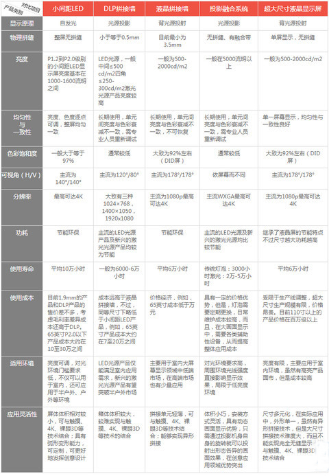 1.小間距LED VS DLP拼接:小間距LED屏在拼縫、亮度、色彩飽和度、分辨率、應(yīng)用靈活性等方面都較有優(yōu)勢;而DLP拼接墻則在畫面細(xì)膩程度、成本等方面更具優(yōu)勢。這兩種技術(shù)將在高端室內(nèi)市場形成直面競爭;